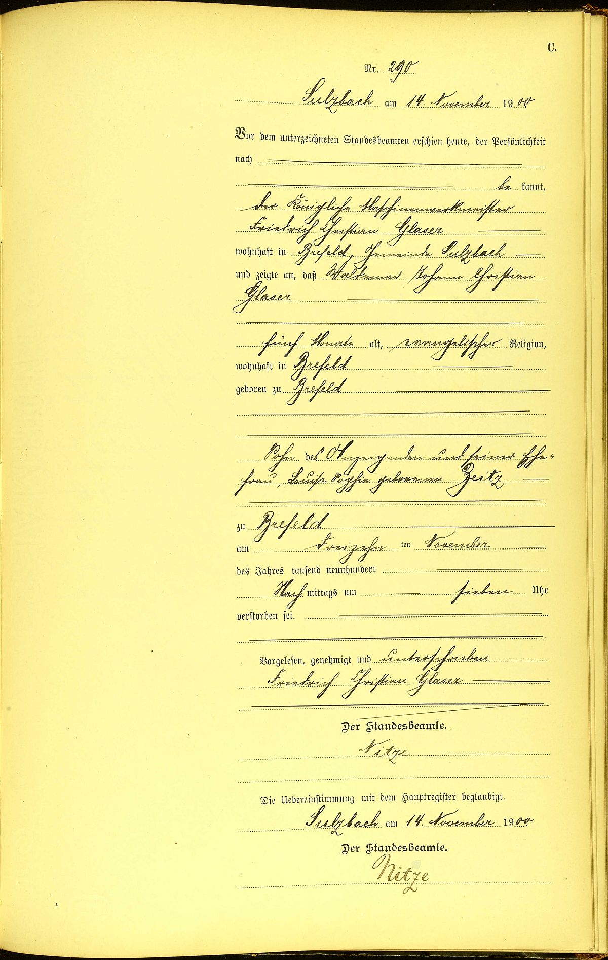 Sterberegister Nr. 290/1900 Standesamt Sulzbach