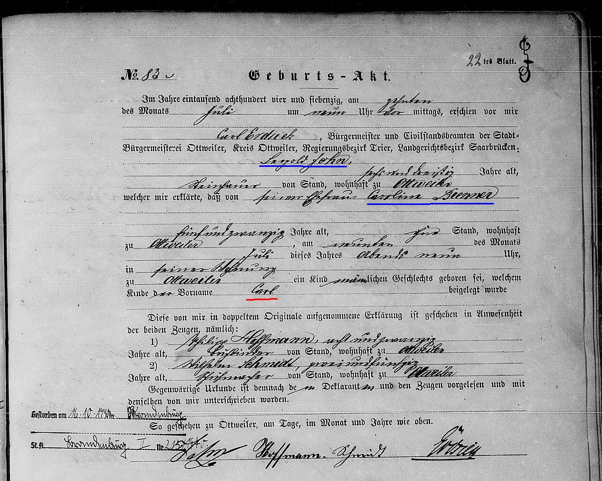 Quelle: Geburtsregister Nr. 83/1874 Zivilstandsregister Ottweiler