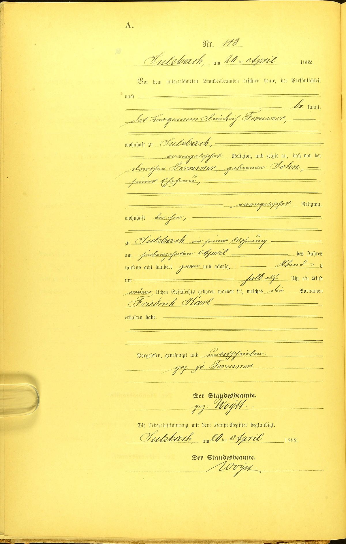 Quelle: Geburtsregister Nr. 143/1882 Standesamt Sulzbach