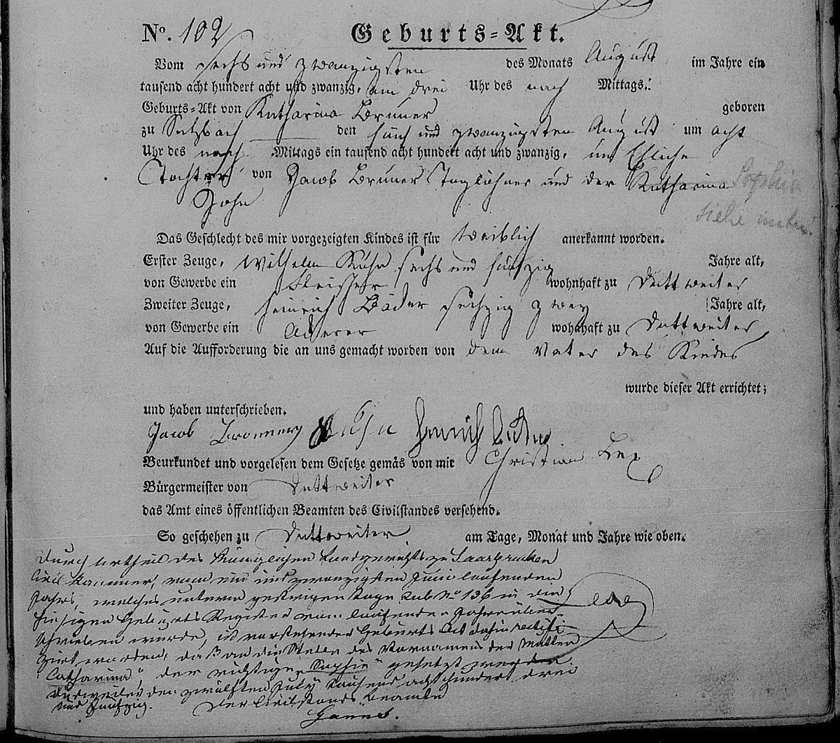 Quelle: Geburtsregister Nr. 102/1828 Zivilstandsregister Dudweiler