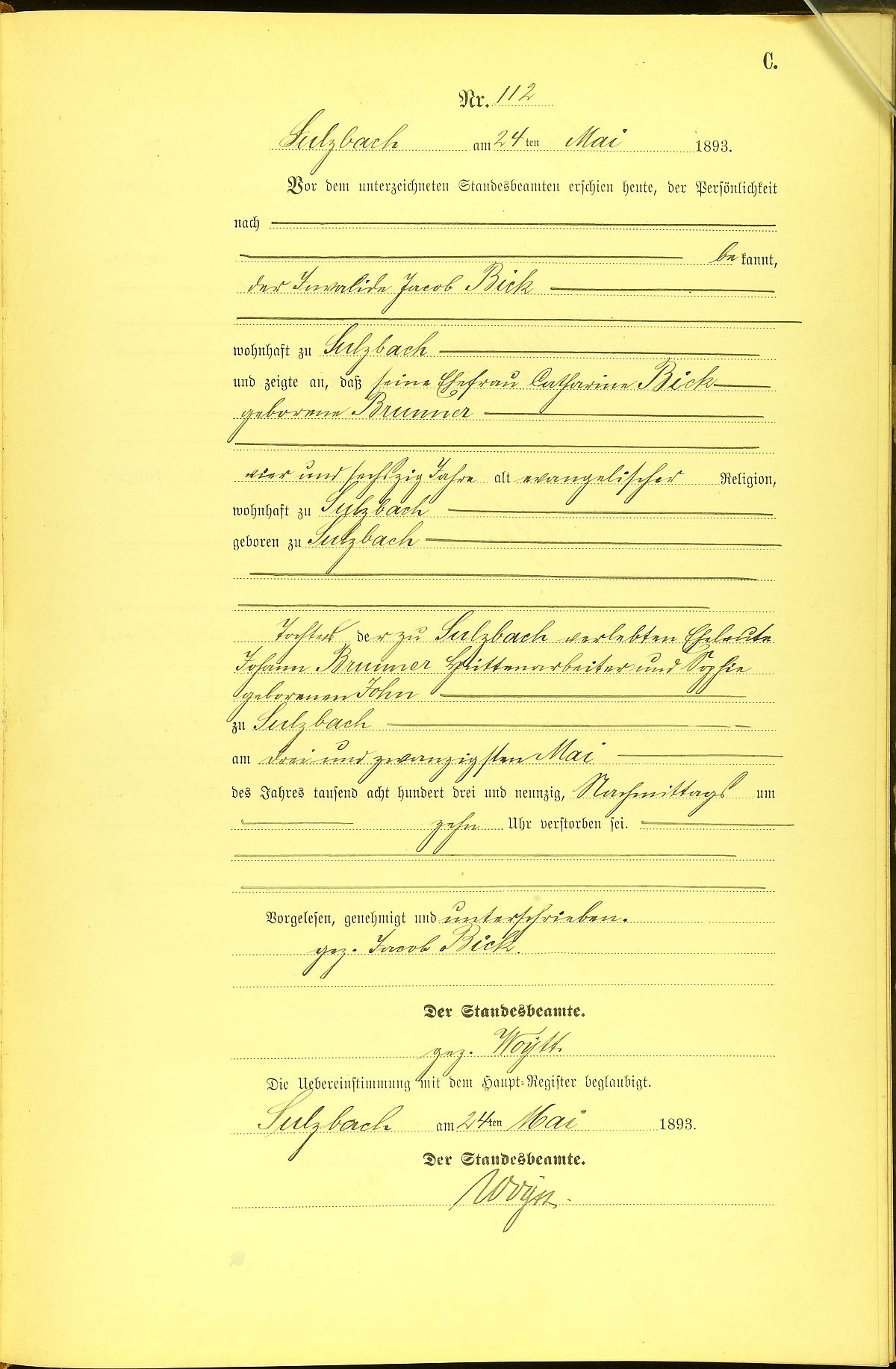 Sterberegister Nr. 112/1893 Standesamt Sulzbach