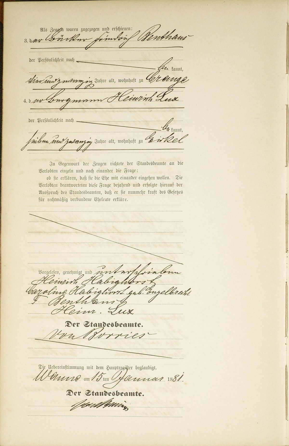 Quelle: Heiratsregister Nr. 4/1881 Standesamt Wanne I