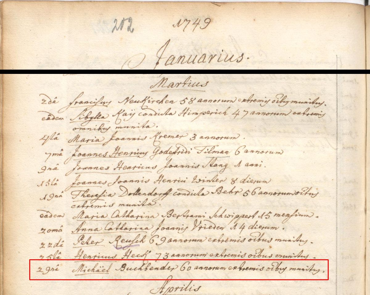 Quelle: Sterbeeintrag Kirchenbuch Seite 212 Jahres 1749 der katholischen Kirche St. Johann Baptist zu Honnef