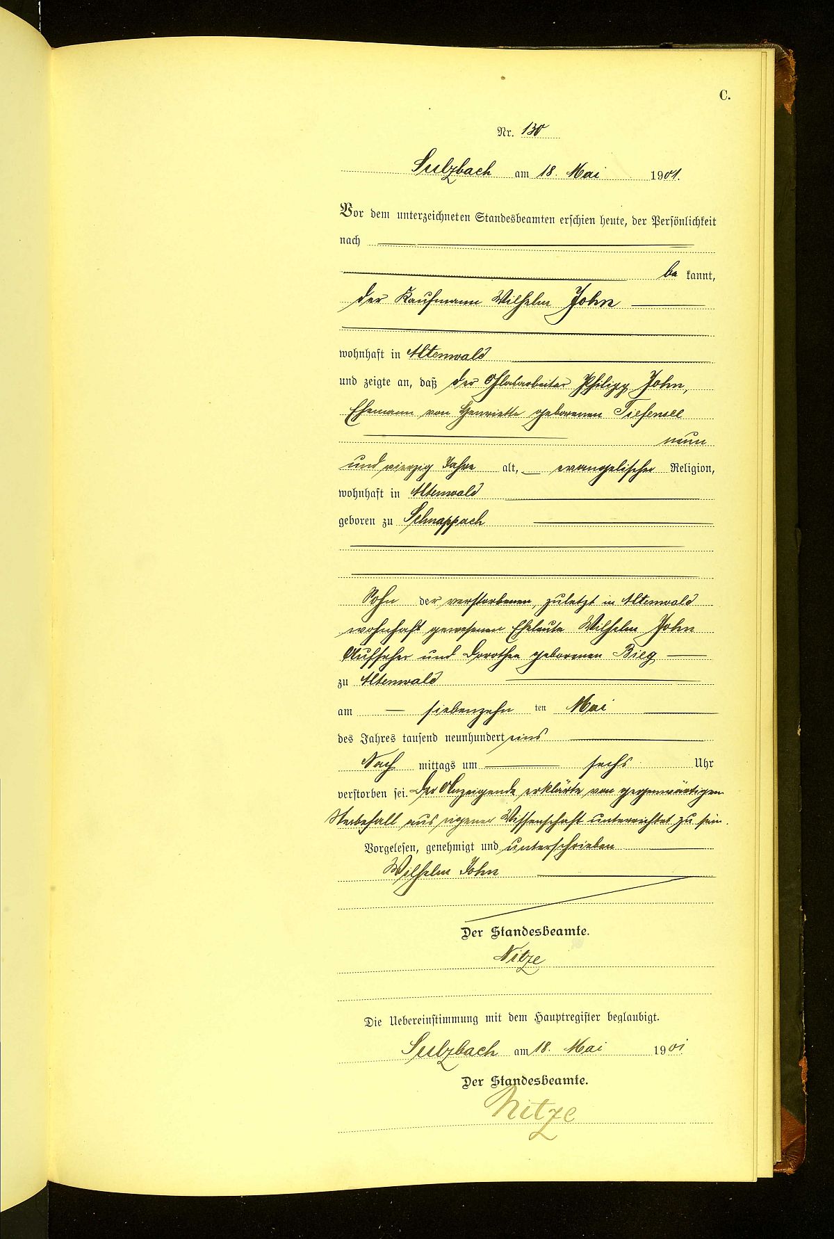 Sterberegister Nr. 130/1901 Standesamt Sulzbach