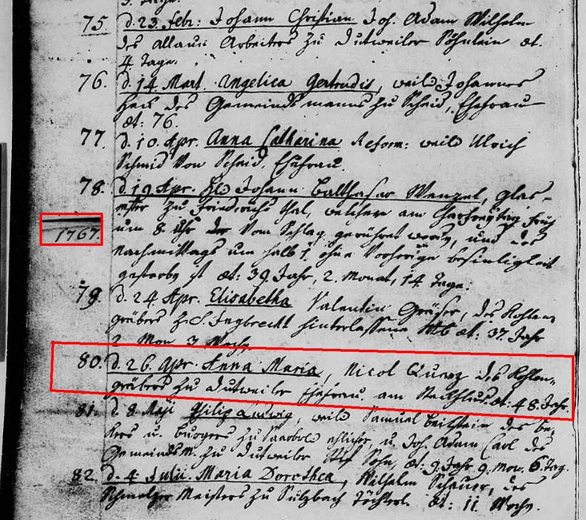 Sterbeeintrag Nr. 80/1767 der Ev.-Kirchengemeinde Dudweiler und Scheidt