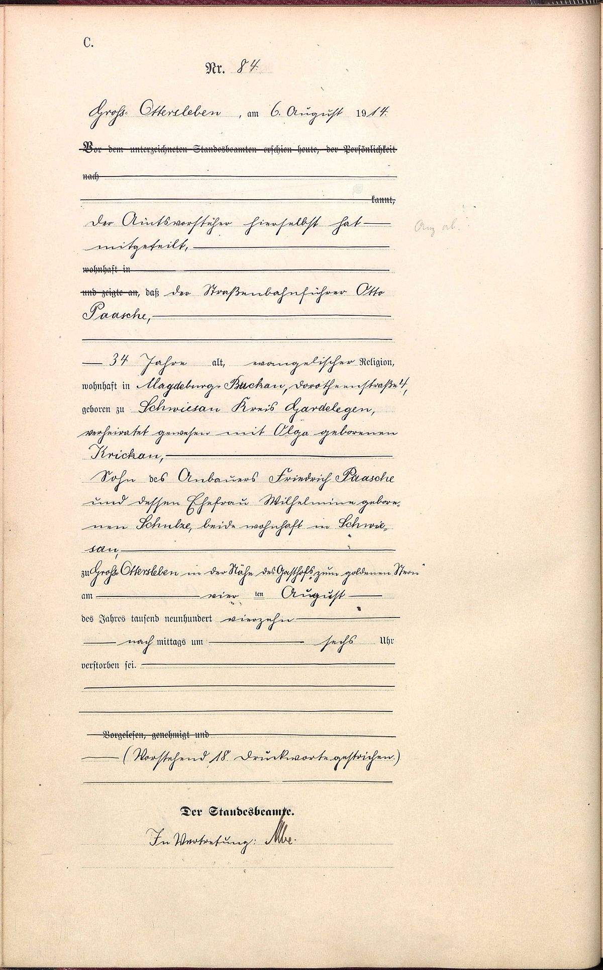 Sterberegister Nr. 84/1914 Standesamt Groß Ottersleben