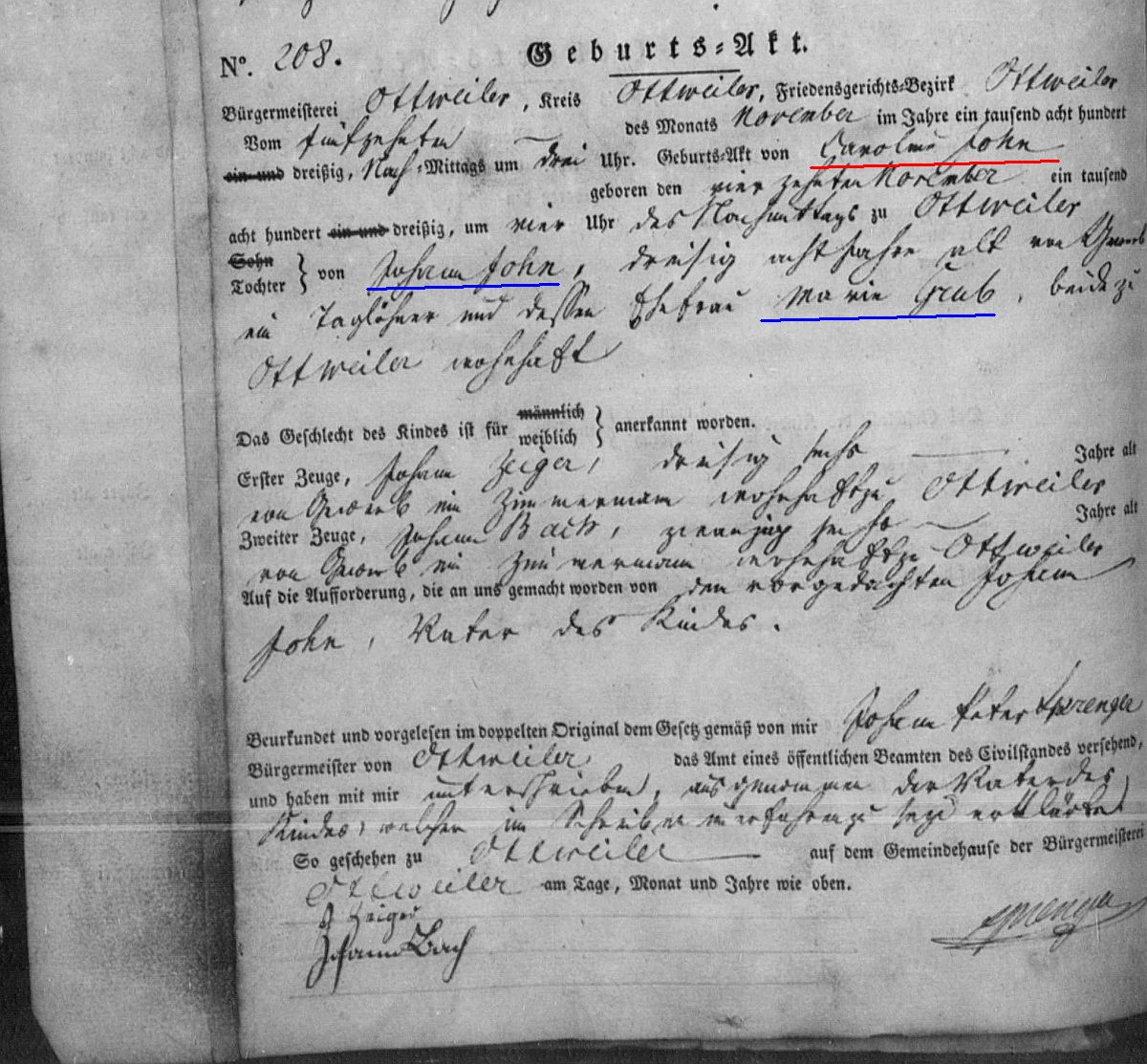 Quelle: Geburtsregister Nr. 208/1830 Zivilstandsregister Ottweiler