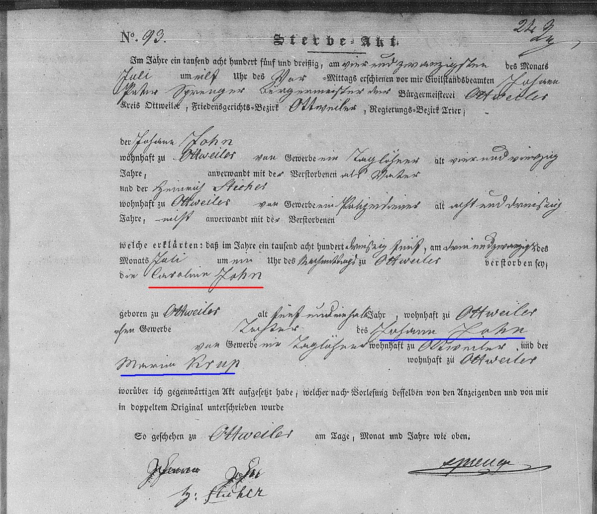 Sterberegister Nr. 93/1835 Zivilstandsregister Ottweiler