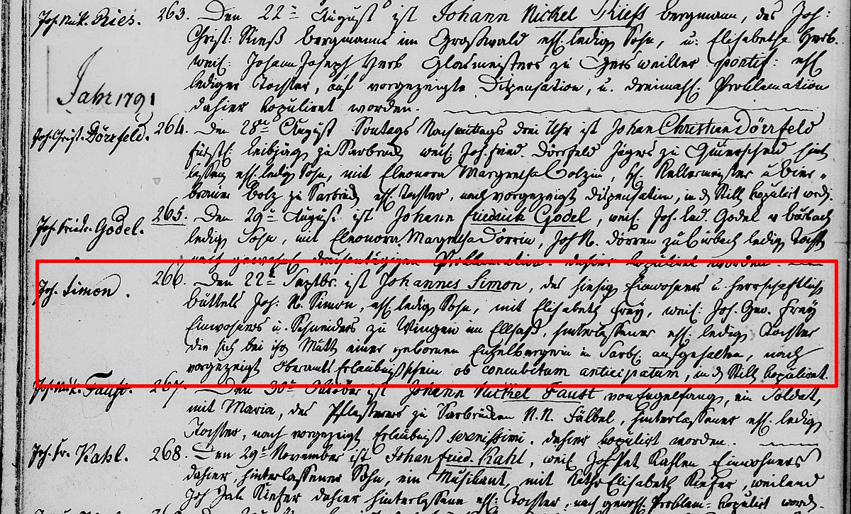 Simon geb. Fray, Elisabethoo 22.09.1791 Malstatt/Saarbrücken Johannes SimonQuelle: Heiratseintrag Nr. 266/1791 der Ev.-Kirchengemeinde Malstatt und Burbach Erstellt mit dem Programm AHNENBLATT (www.ahnenblatt.de).