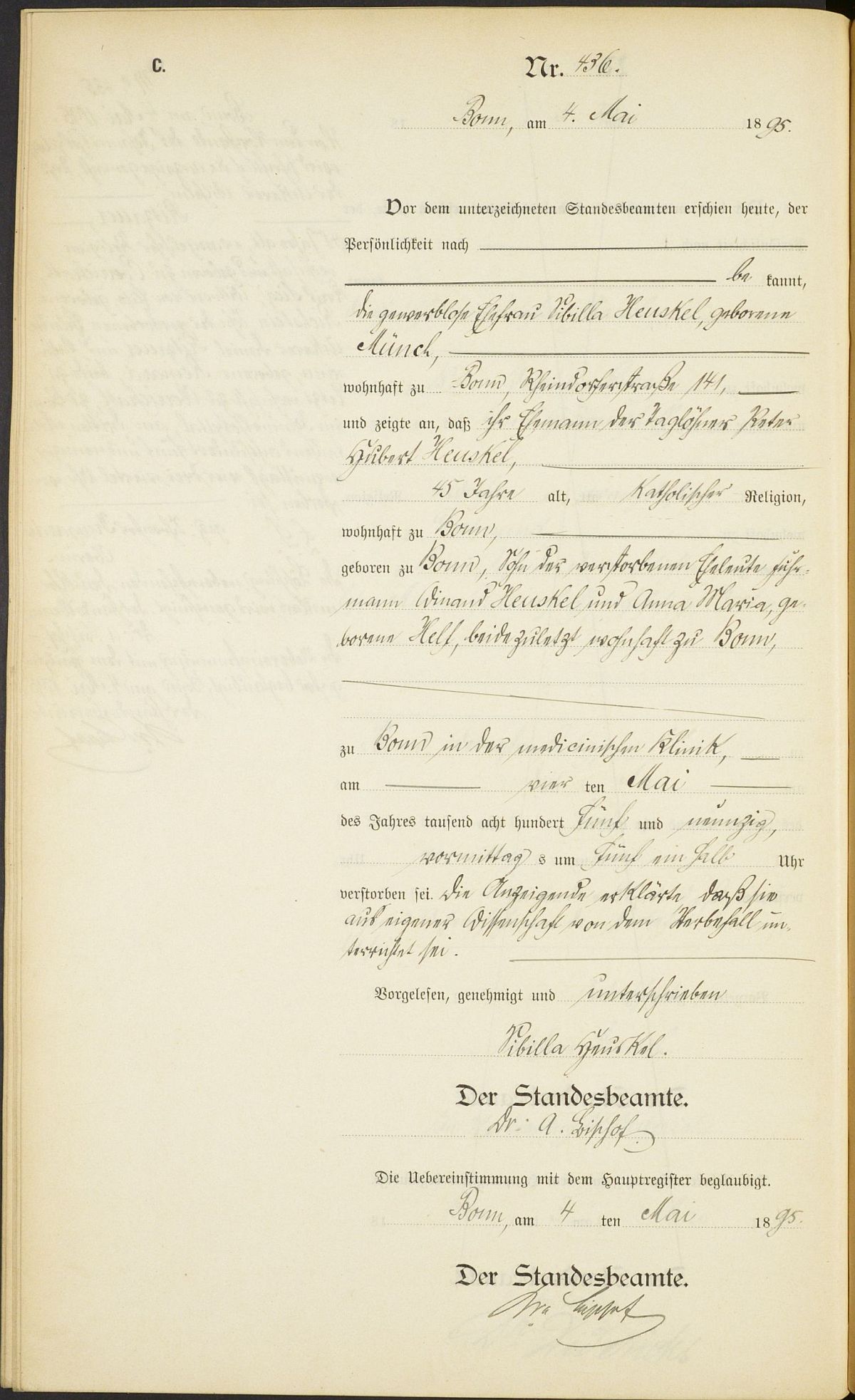 Sterberegister Nr. 436/1895 Standesamt Bonn