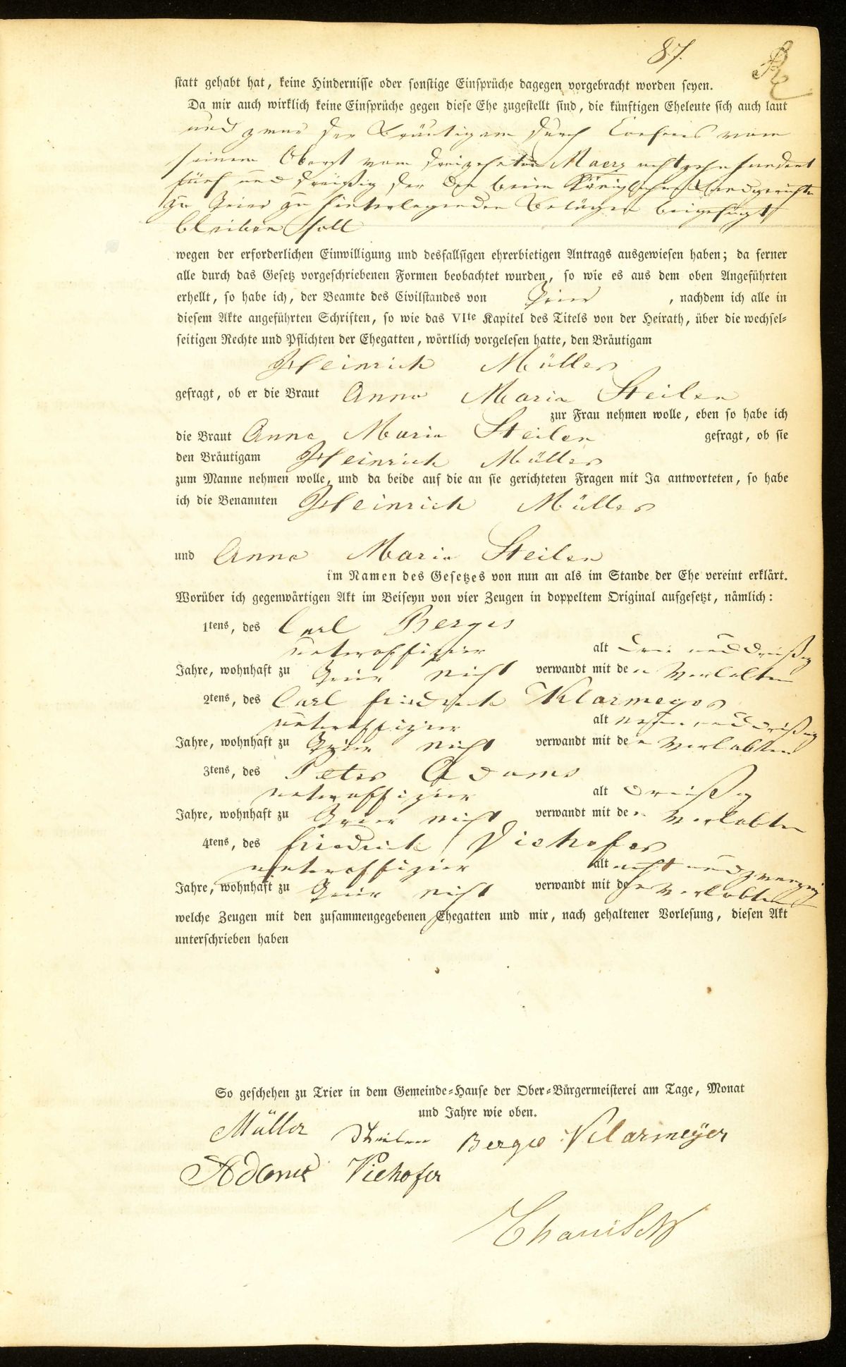 Quelle: Heiratsregister Nr. 85/1835 Zivilstandsregister Trier
