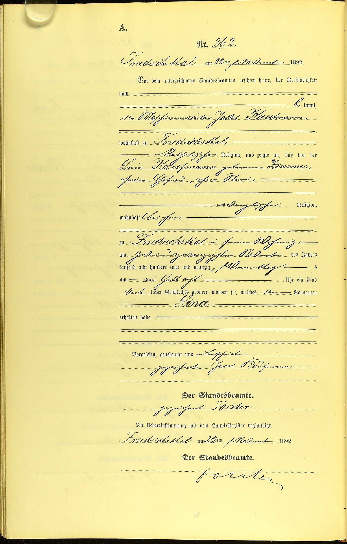 Quelle: Geburtsregister Nr. 262/1892 Standesamt Friedrichsthal