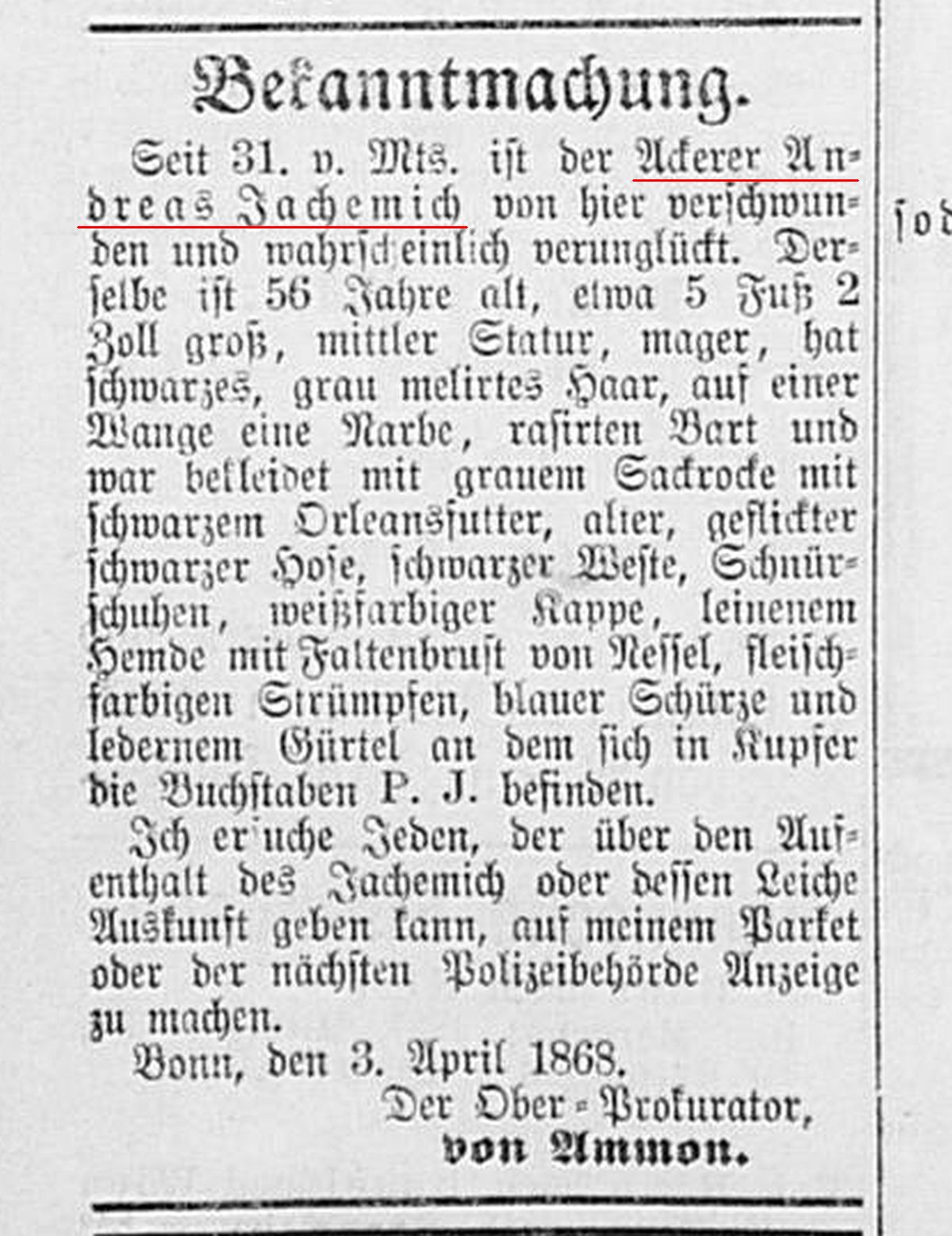 Vermisstenanzeige lt. Zeitungsbericht "Bonner Zeitung" vom 04.04.1868