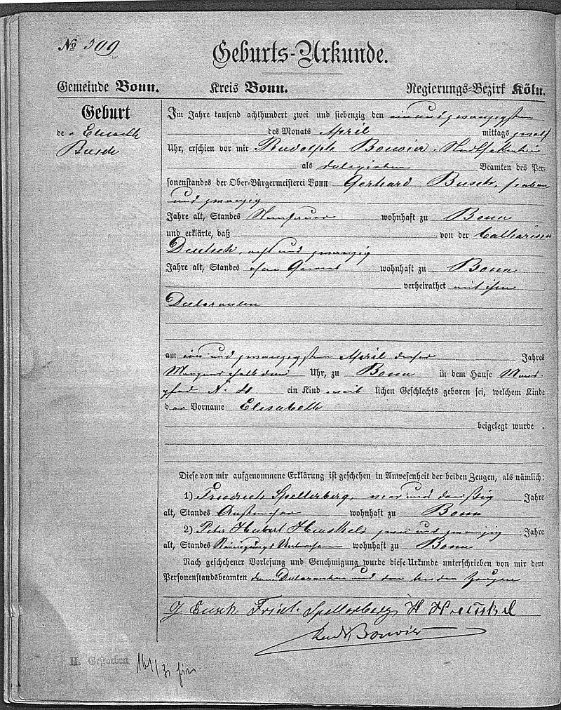 Quelle: GeburtsregisterNr. 309/1872 Zivilstandsregister Bonn