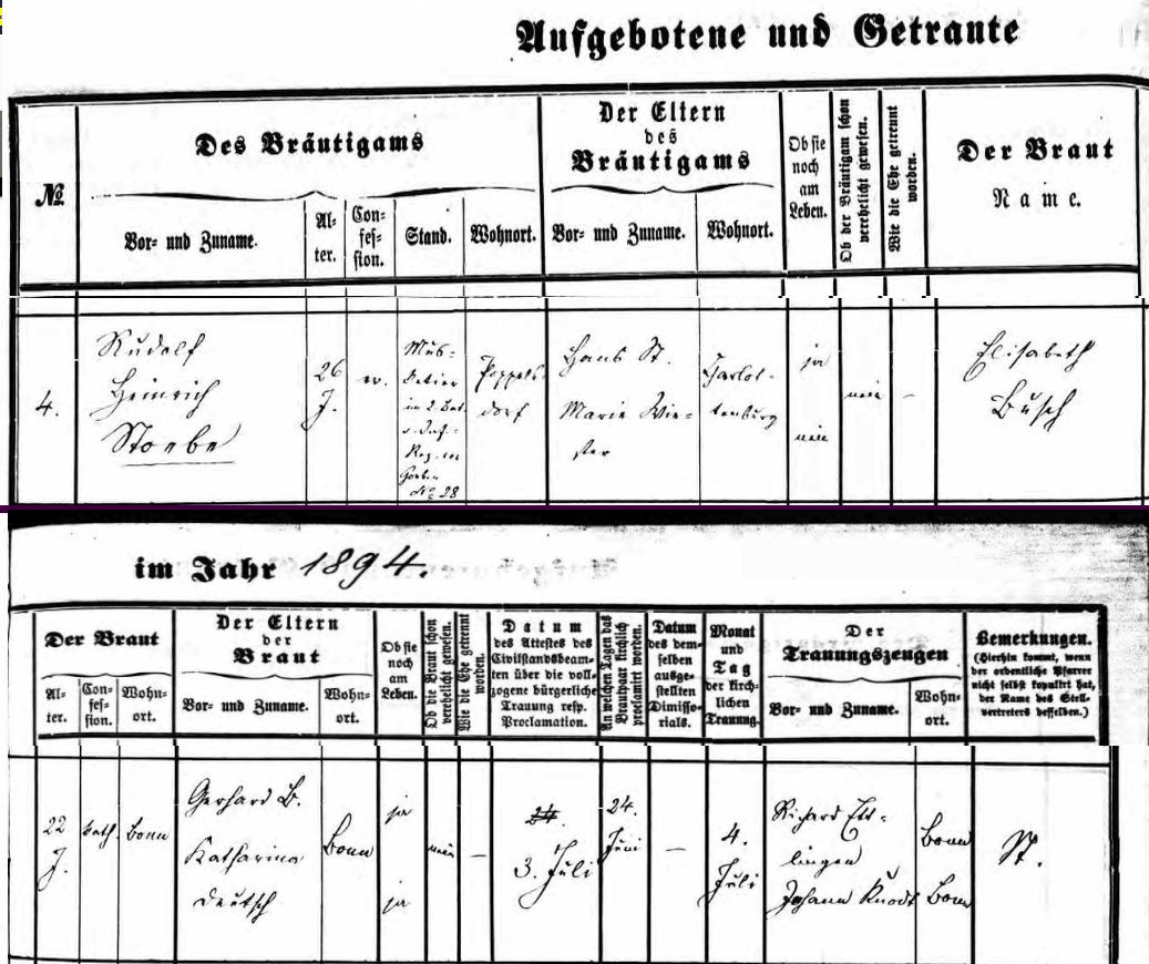 Heiratsdaten Evang. Garnisongemeinde Bonn (kirchliche Trauung 04.07.1894).