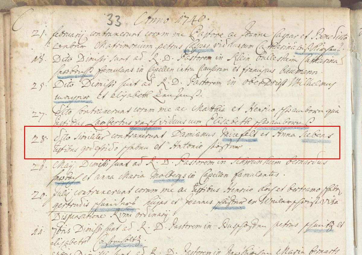 Quelle: Heiratseintrag 1740 im kath. Kirchenbuch St. Kunibert zu Heimerzheim