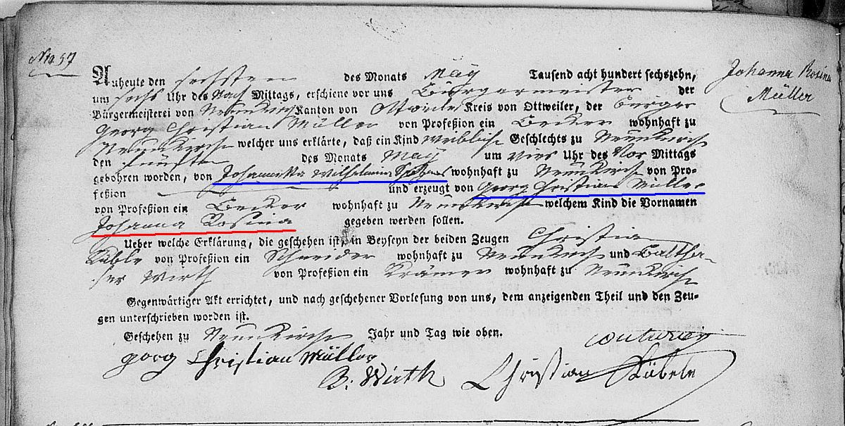 Quelle: Geburtseintrag Nr. 57/1816 des Zivilstandsregisters Neunkirchen, Kreis Ottweiler