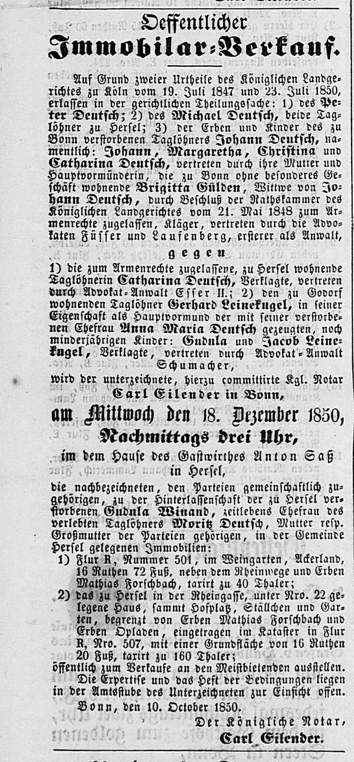 Erbversteigerung Grundbesitz lt. Zeitungsannonce "Bonner Zeitung" vom 27.10. und 24.11.1850