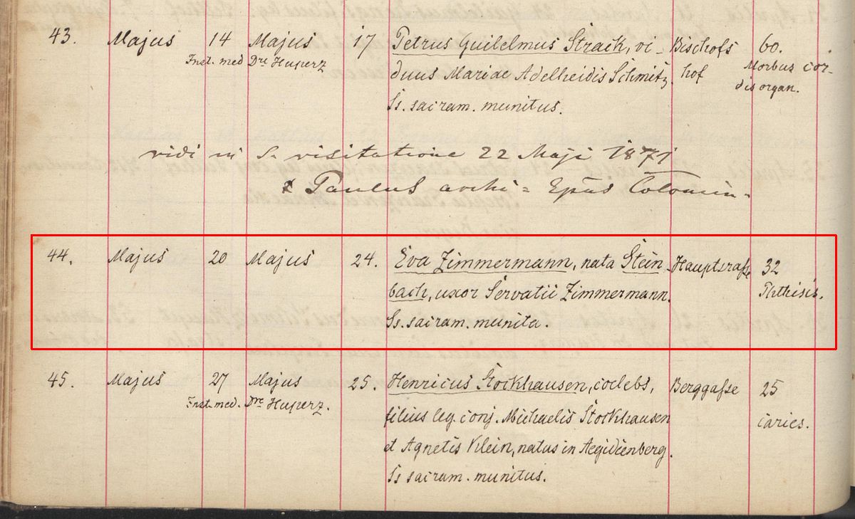 Sterbeeintrag Kirchenbuch Seite 78 Zeile 44 des Jahres 1871 der katholischen Kirche St. Johann Baptist zu Honn96