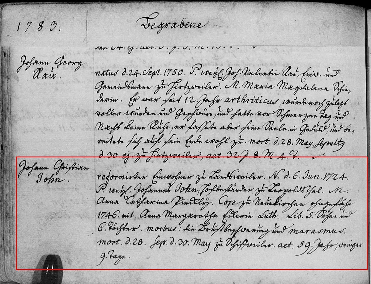 Sterbeeintrag 1783 ev. Kirchengemeinde Ottweiler (5 Söhne, 6 Töchter)