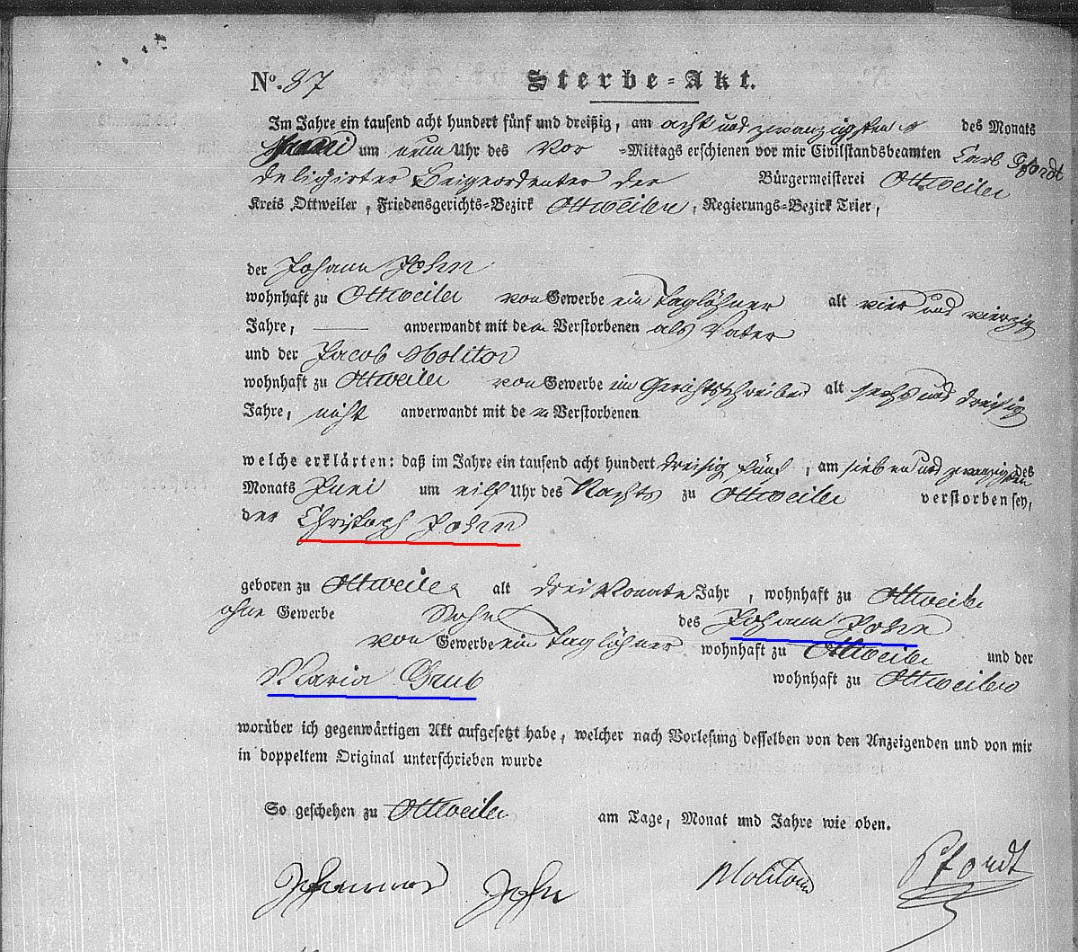 Quelle: Geburtsregister Nr. 66/1835 Zivilstandsregister Ottweiler