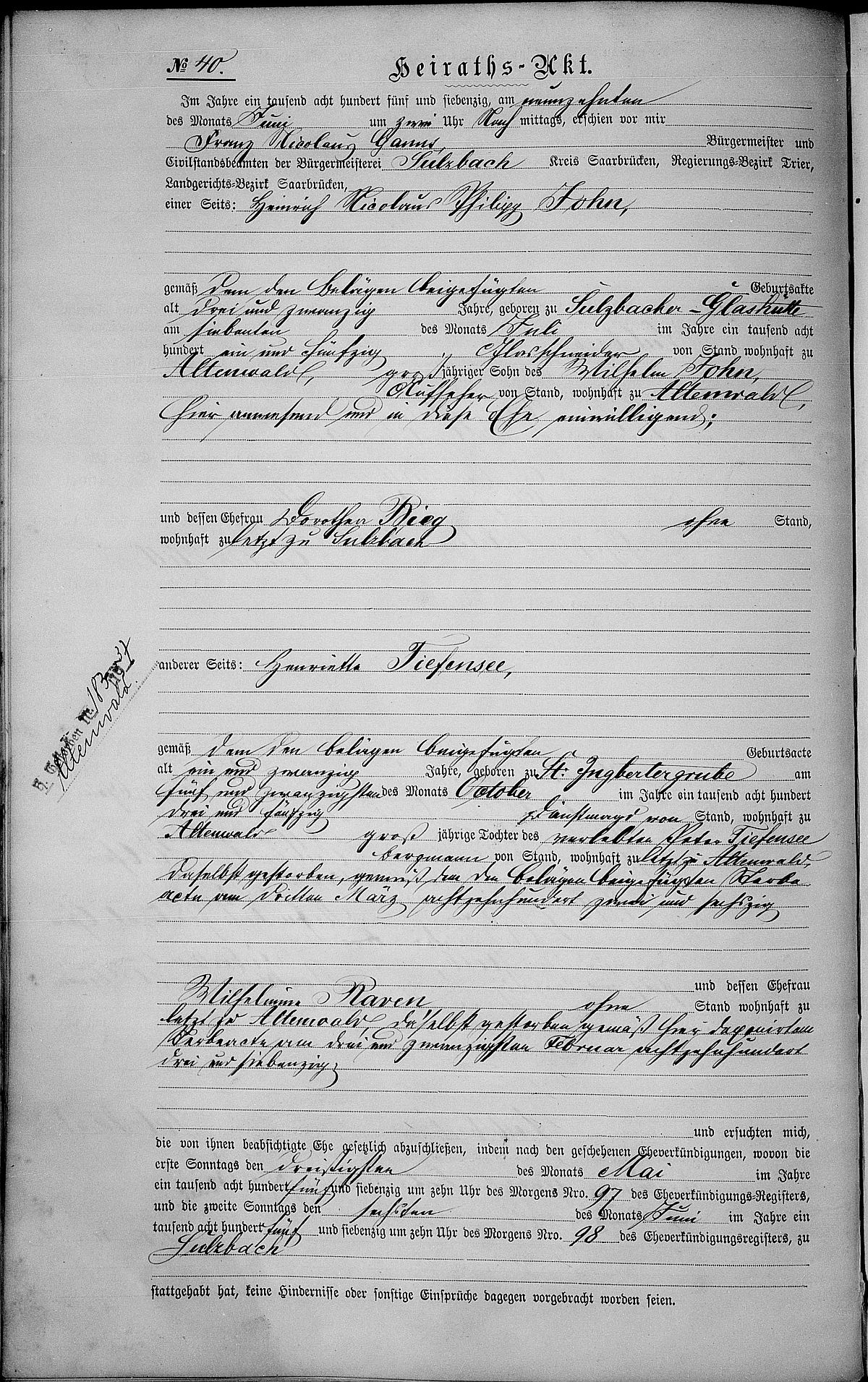 Heiratsregister Nr. 40/1875 Zivilstandsregister Sulzbach
