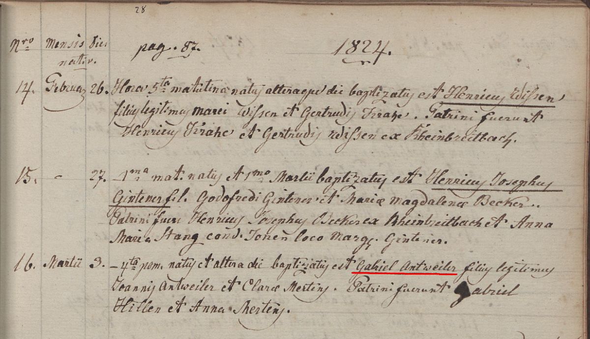 Quelle: Taufe Kirchenbuch Seite 87 des Jahres 1824 in der katholischen Kirche St. Johann Baptist zu Honnef