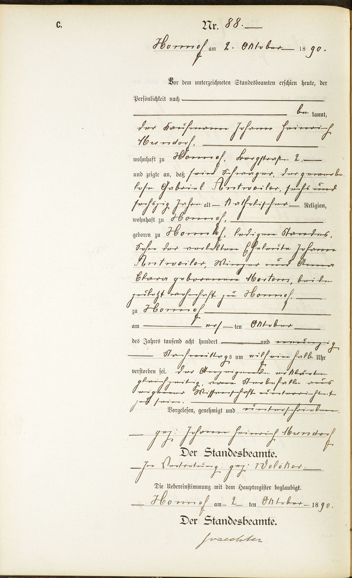 Sterberegister Nr. 88/1890 Standesamt Honnef