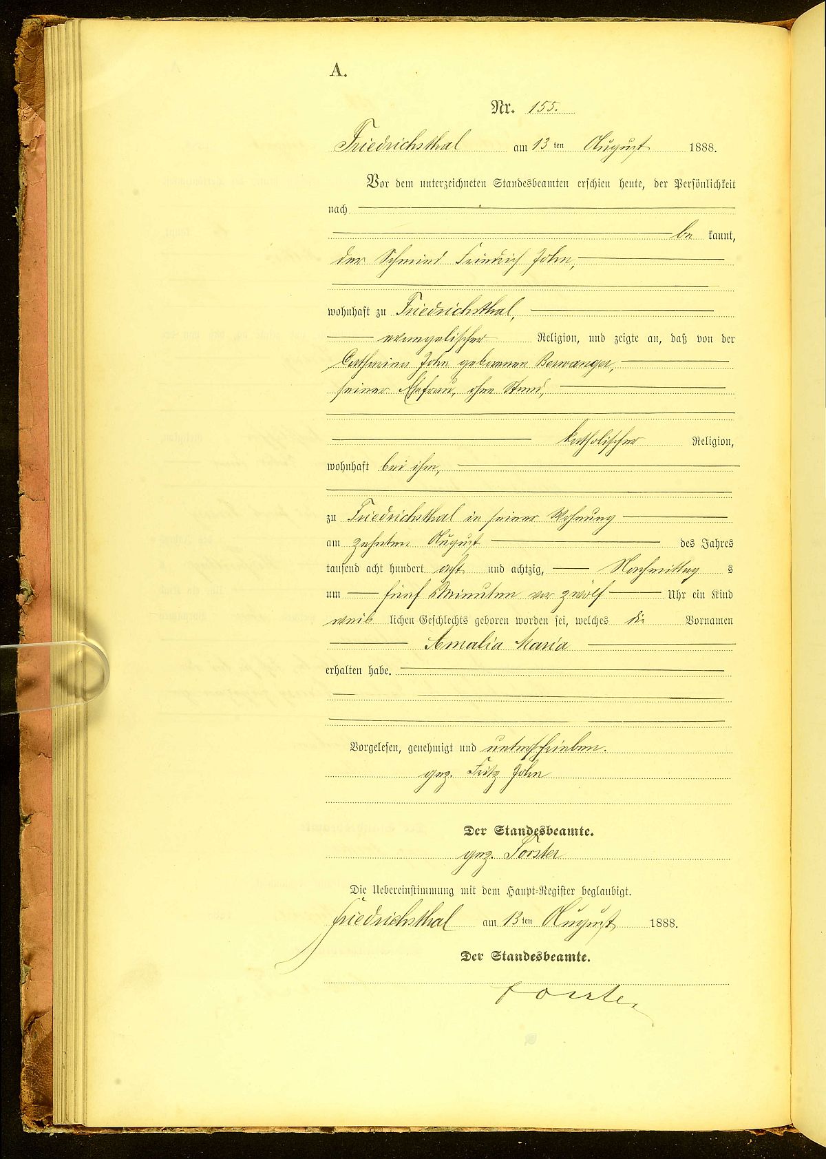 Quelle: Geburtsurkunde Nr. 155/1888 Standesamt Friedrichsthal
