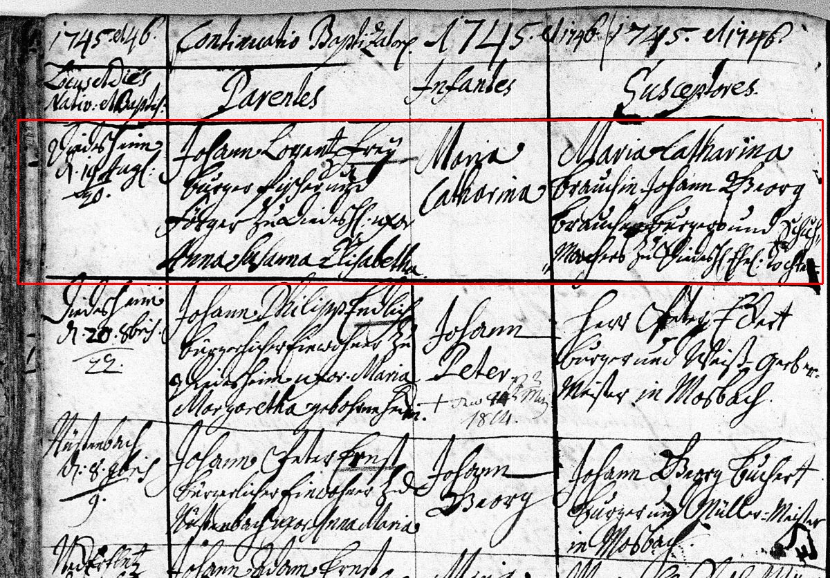Quelle: Kirchbucheintrag der Taufe Kichenbuch 1745 der ev. Kirchengemeinde Neckarelz.