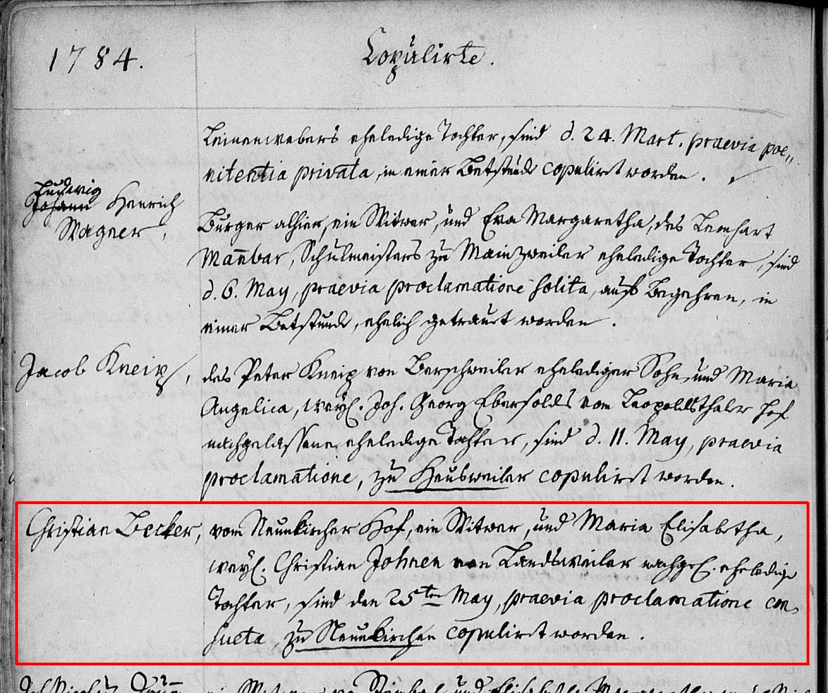 Quelle: Heiratseintrag 1784 ev. Kirchengemeinde Ottweiler