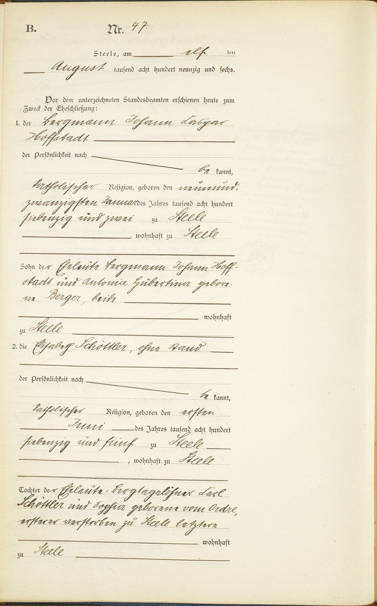 Heiratsregister Nr. 47/1896 Standesamt (Essen-)Steele, Zeugen: Johann Hoffstadt und Heinrich Sponheuer