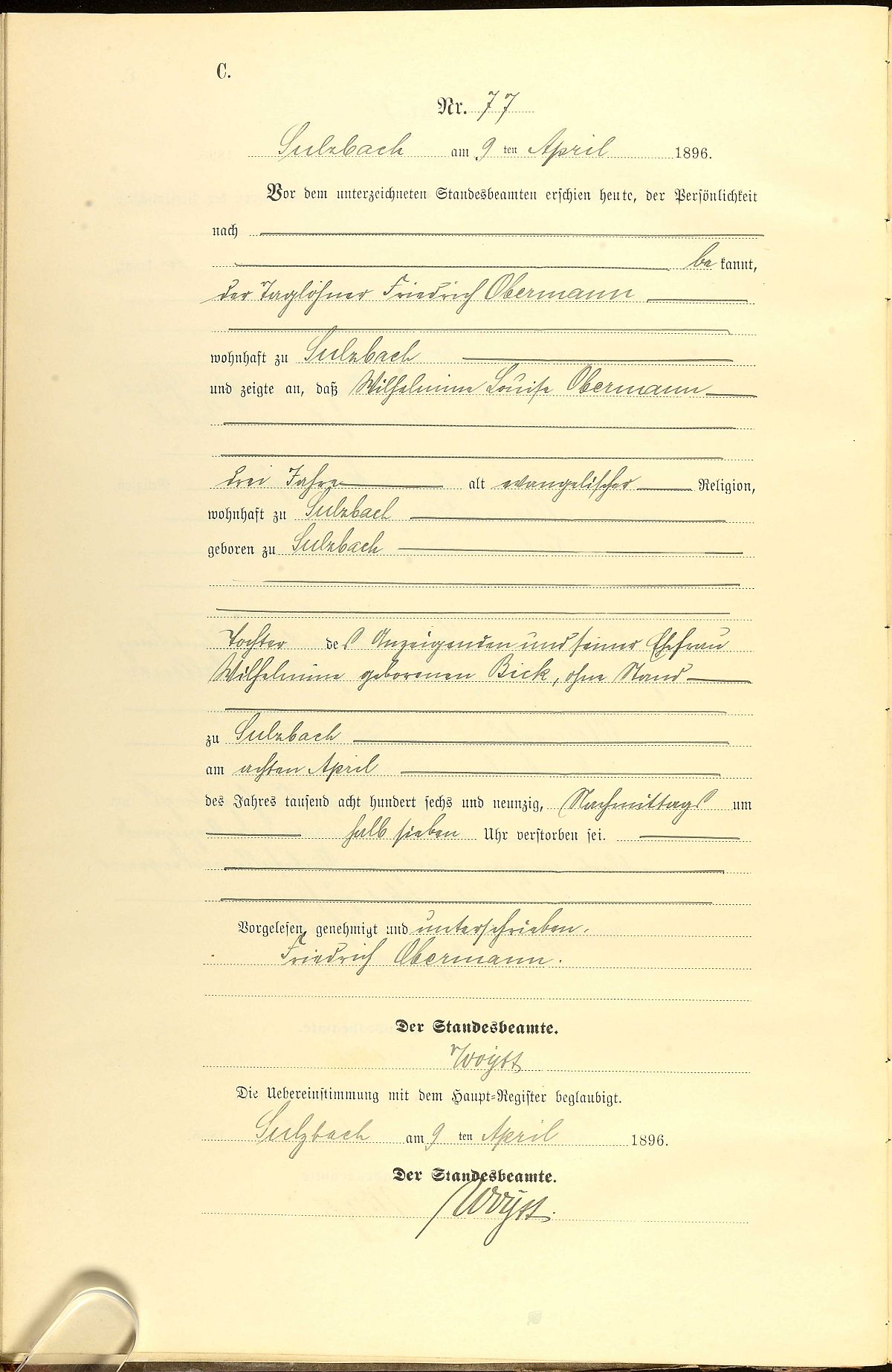 Sterberegister Nr. 77/1896 Standesamt Sulzbach