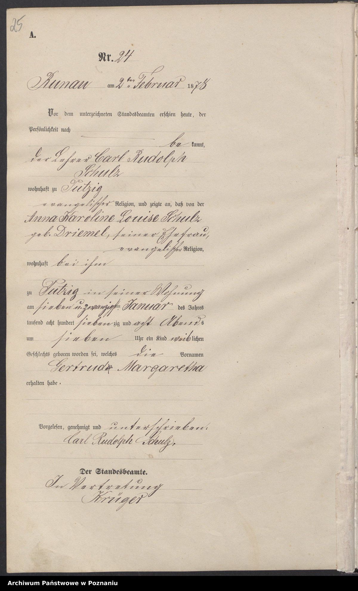 Quelle: Geburtsurkunde Nr. 24/1878 Standesamt Runau (zuständig für Putzig)