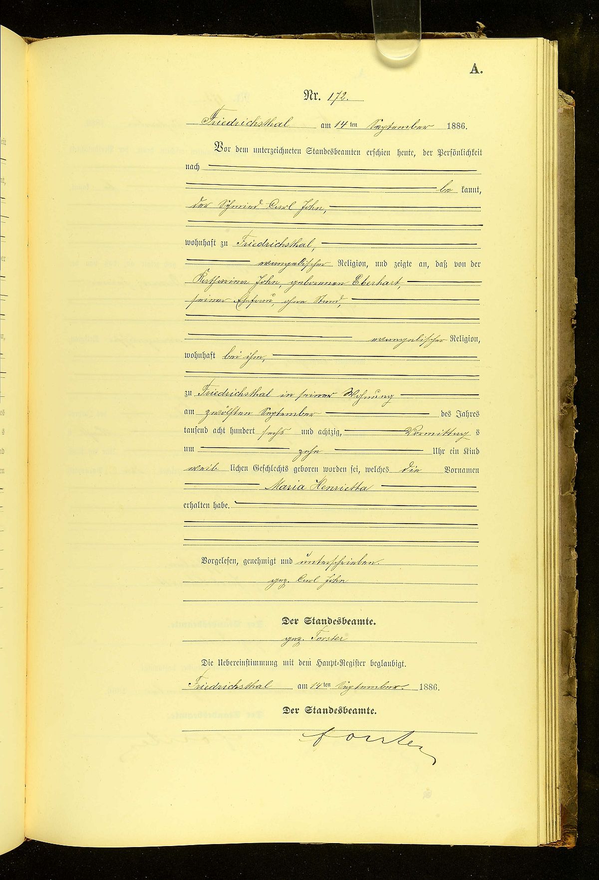 Quelle: Geburtsregister Nr. 172/1886 Standesamt Friedrichsthal