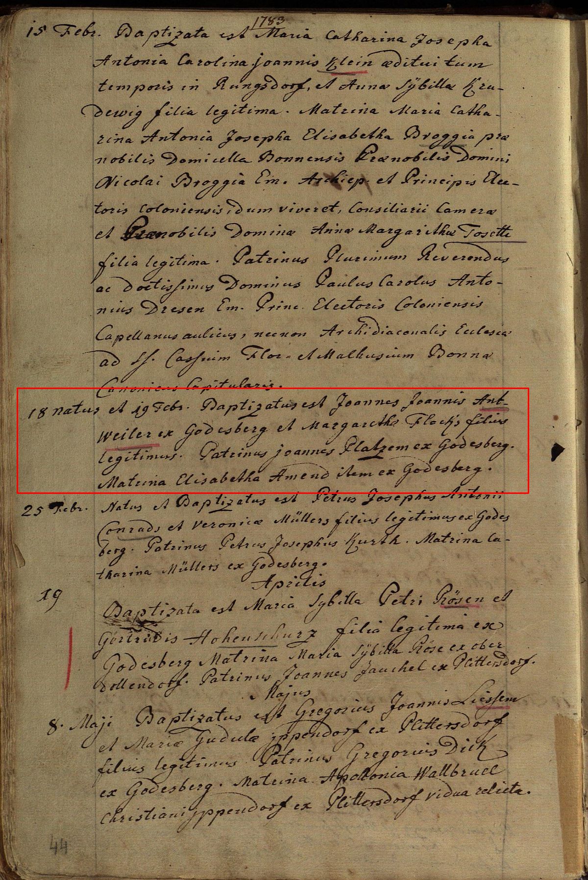 Quelle: Taufe Kirchenbuch Seite 44 des Jahres 1783 in der katholischen Kirche St. Andreas zu Rüngsdorf