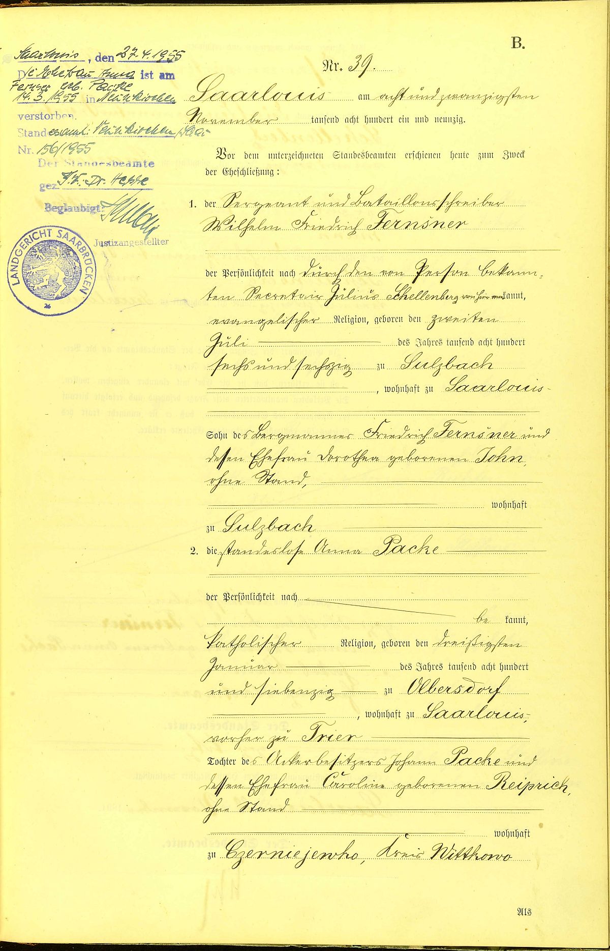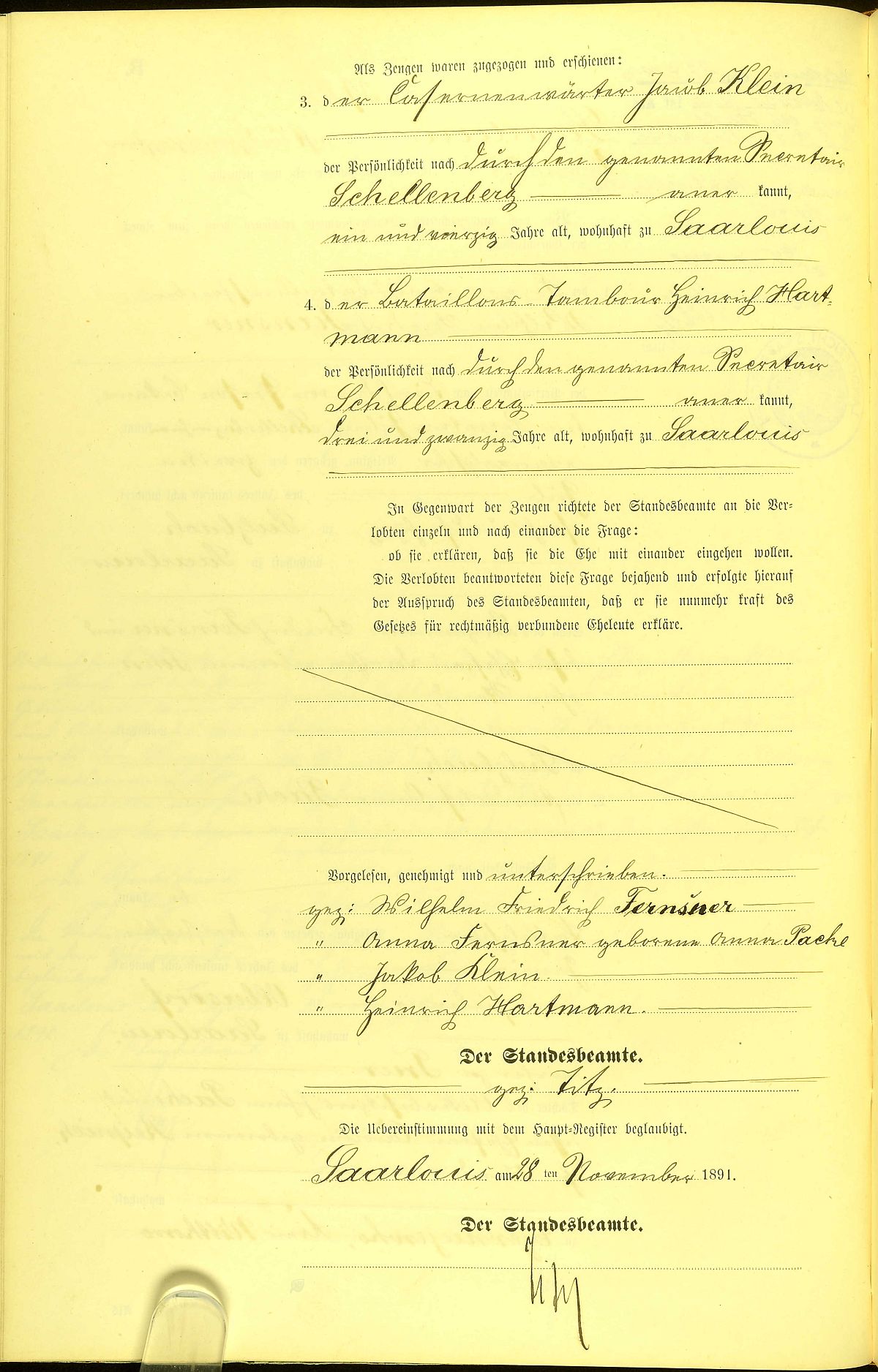 Quelle: Heiratsregister Nr. 39/1891 Standesamt Saarlouis