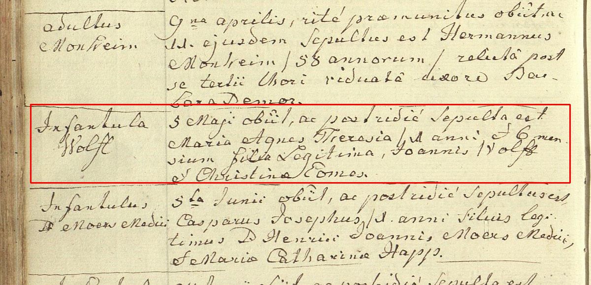 Vater: Joanni Wilhelmo Wolff Mutter: Christine Wolff geb. Comes Geschwister: Maria Agnes Apollonia Wolff Joanna M. Ther. Wolff
