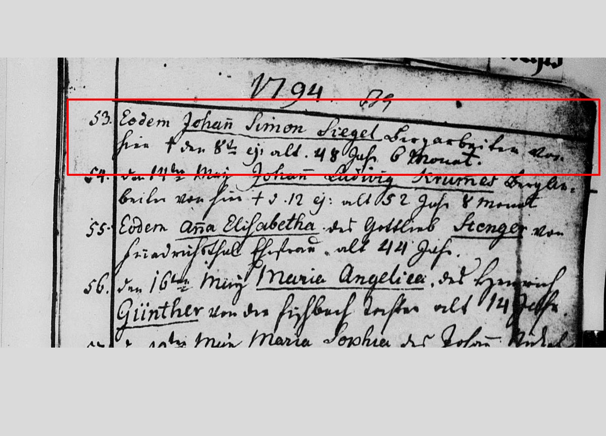 Sterbeeintrag Nr. 53/1794 der Ev.-Kirchengemeinde Dudweiler und Scheidt