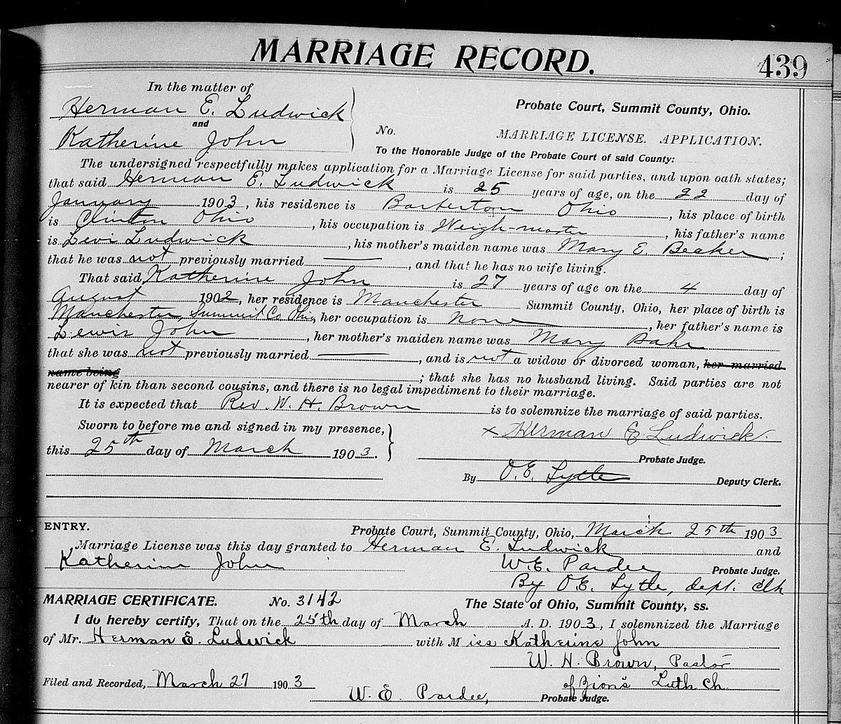 oo 25.03.1903 Summit County, Ohio, USA Catharine Ludwick geb. Johns