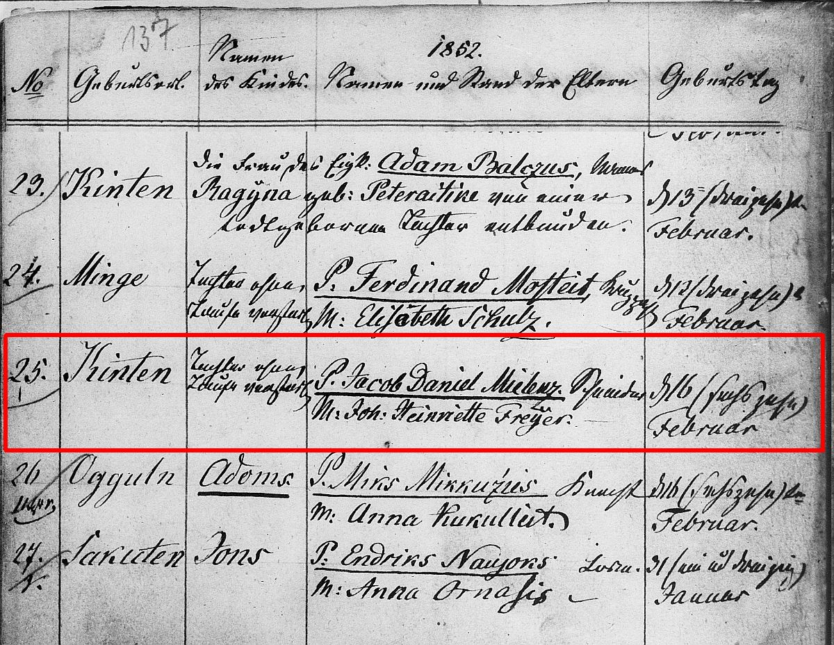 Quelle: Taufeintrag Nr. 25/1852 der ev. Kirche Kinten (Kreis Heydekrug)
