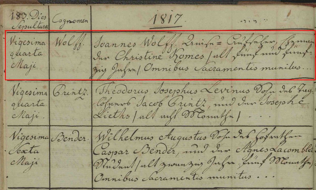 Sterbeeintrag im kath. Kirchenbuch 1817 St. Lambertus in Düsseldorf