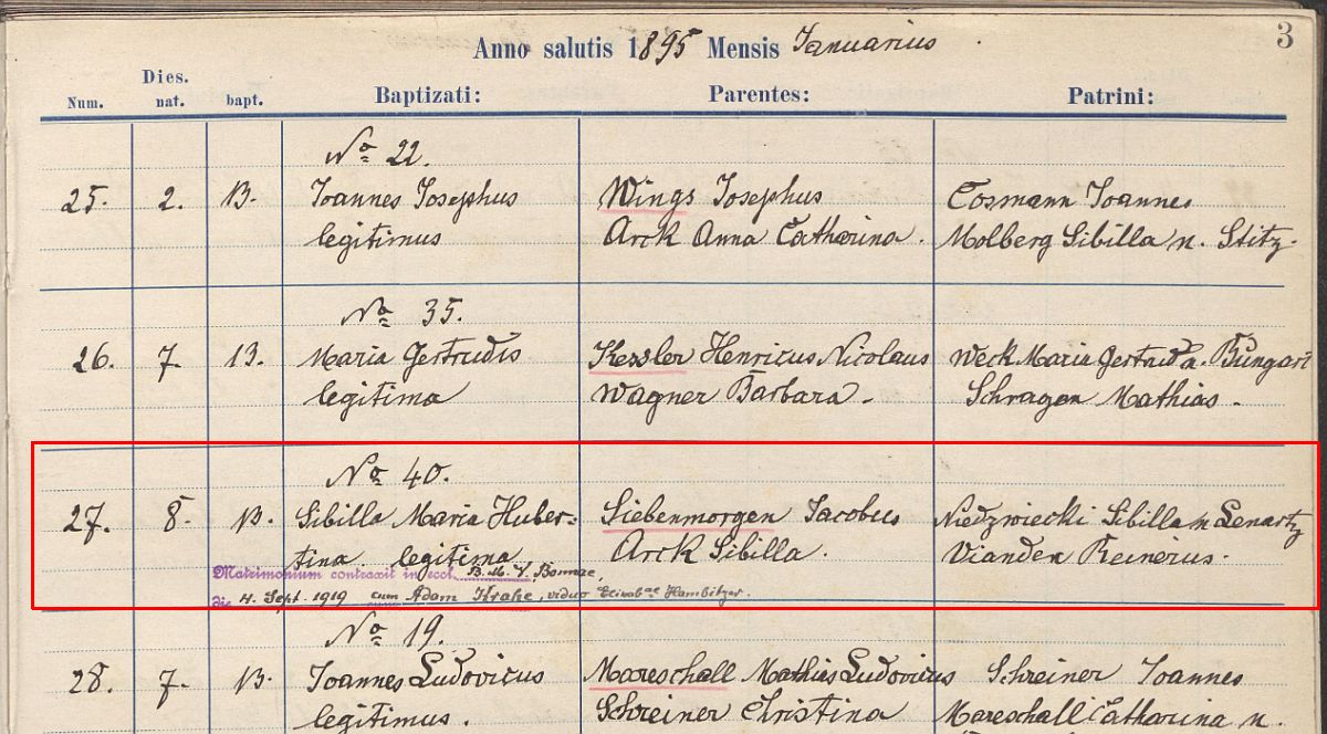 Taufeintrag 1895 Stiftskirche Bonn Seite 3 / mit Querverweis auf Trauung mit Adam Krahe (Witwer von Elisabeth Hambitzer?) - der Ort ist leider nicht lesbar.