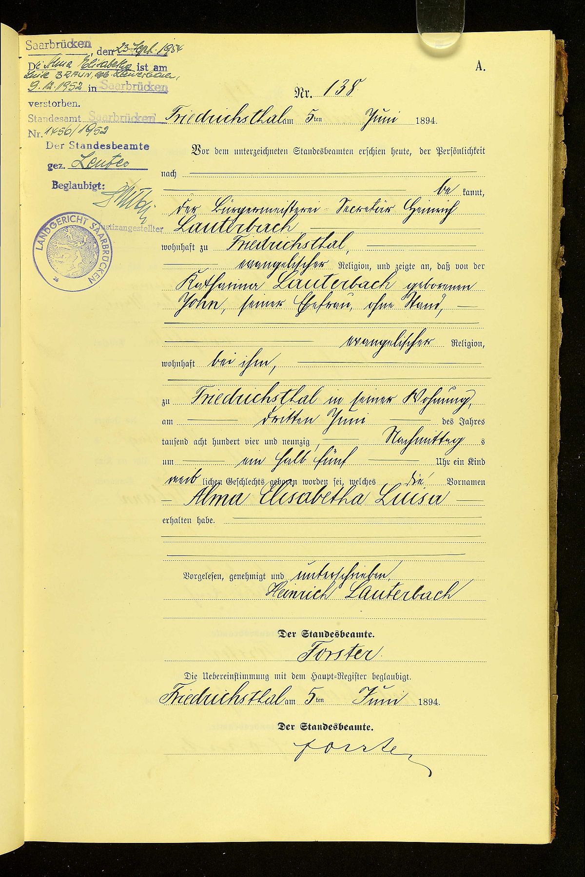 Quelle: Geburtsurkunde Nr. 138/1894 Standesamt Friedrichsthal