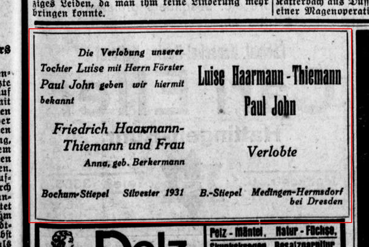 Quelle: Verlobungsanzeige "Bochumer Tageblatt" vom 30.12.1931