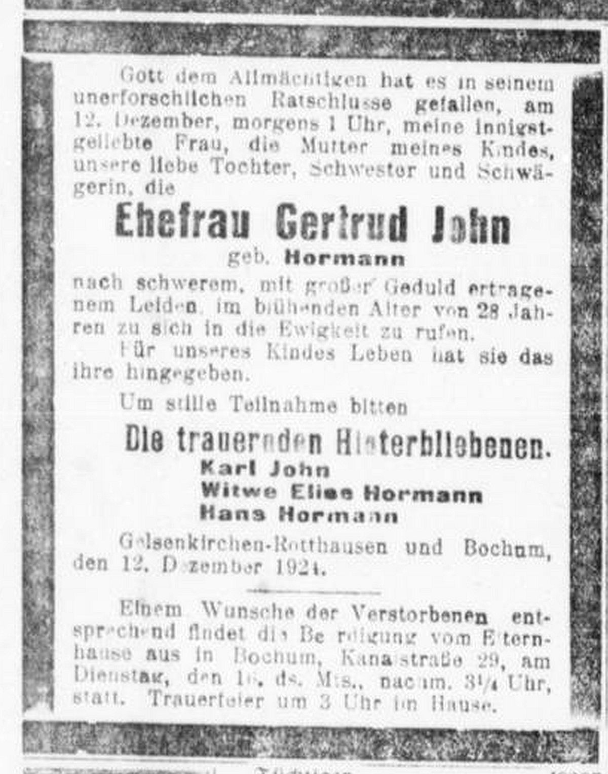 Sterbeanzeige "Gelsenkirchener Allgemeine Zeitung" vom 13.12.1924