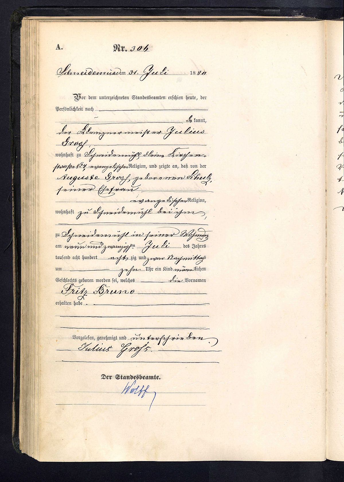 Quelle: Geburtsurkunde Standesamt Schneidemühl Nr. 306/1880