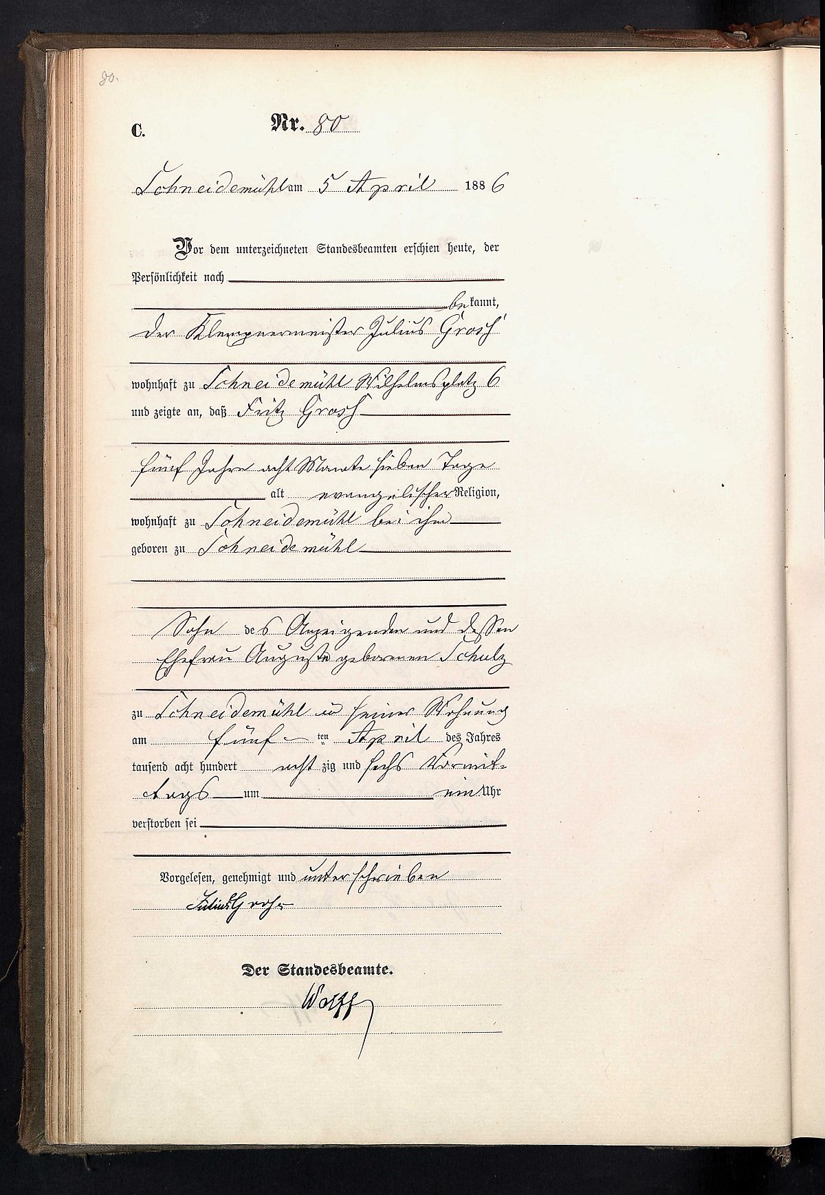 Sterbeurkunde Standesamt Schneidemühl Nr. 80/1886