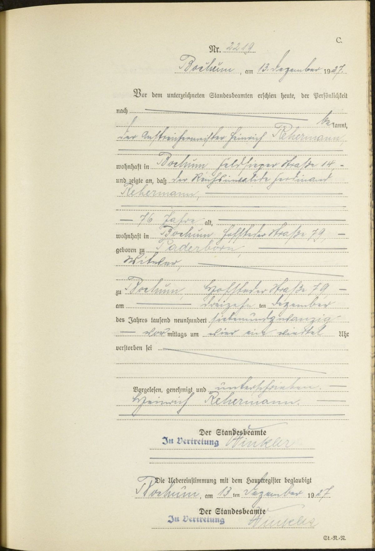 Sterberegister Nr. 2219/1927 Standesamt Bochum-Mitte