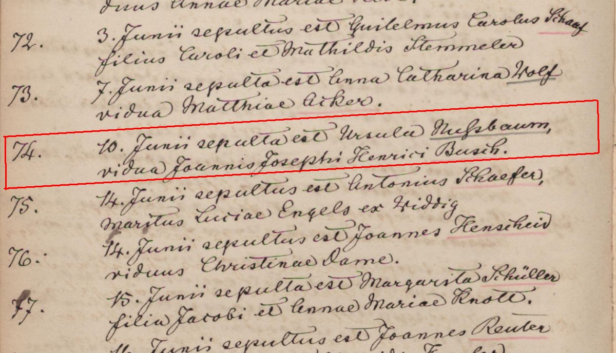 Sterbeeintrag Kirchenbuch Zeile 74 des Jahres 1863 der Stiftskirche zu Bonn